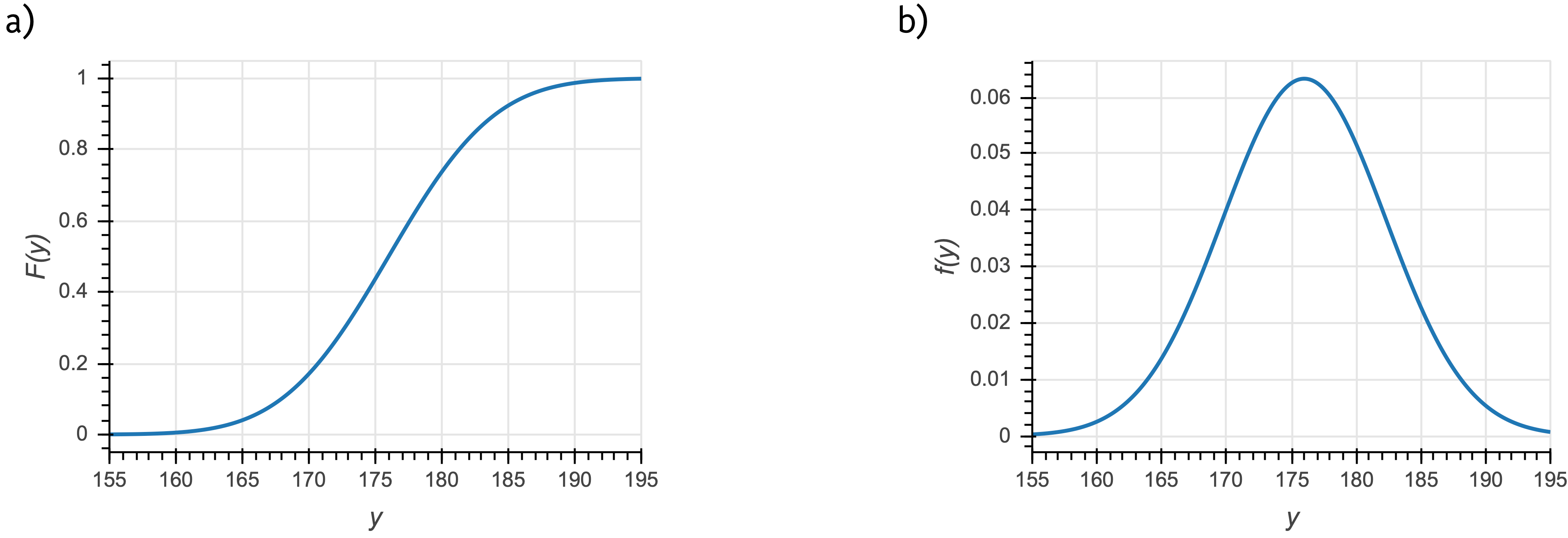The function \(F(y)\), which returns a probability, is called a cumulative distribution function (CDF), or just distribution function. It contains all of the information we need to know about how probability is assigned to \(y\). A CDF for a Normal distribution is shown in the left panel of the figure below.